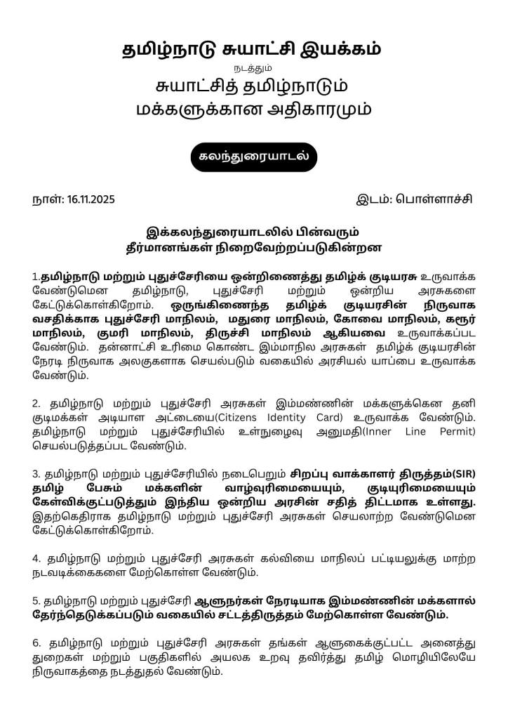 கடந்த ஞாயிற்றுக் கிழமை(16.11.2025) அன்று பொள்ளாச்சியில் சுயாட்சித் தமிழ்நாடும் மக்கள் அதிகாரமும் என்கிற தலைப்பில் கலந்துரையாடல் நடைபெற்றது.